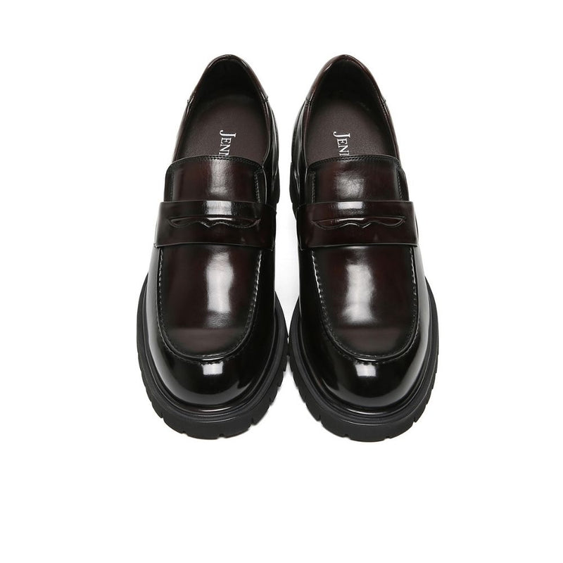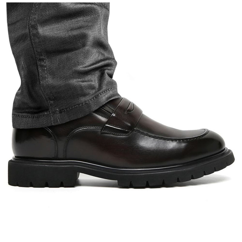 These dark brown penny loafers hit that sweet spot between classic and contemporary. They’re crafted from smooth, full-grain leather that feels as good as it looks, with a polished finish that adds a touch of sophistication. The strap across the vamp keeps things traditional, while the chunky rubber sole brings a modern edge — stylish, durable, and perfect for all-day wear.