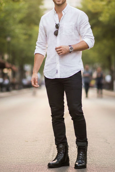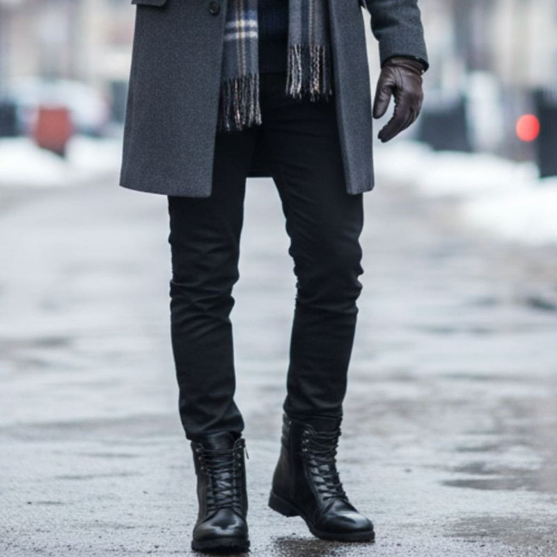 Stepping through the seasons with confidence, these versatile black leather boots prove to be the ultimate anchor for any modern wardrobe. For a refined winter aesthetic, they pair exceptionally well with a structured charcoal overcoat layered over a navy ribbed sweater and tailored black trousers, finished with a classic plaid scarf and leather gloves for a look that is as warm as it is sophisticated. Transitioning into the warmer months, the same boots offer a sharp edge to a relaxed summer ensemble featuring a crisp white linen button-down with rolled sleeves and slim-fit black denim, creating a balanced silhouette that is perfect for a stylish city stroll.