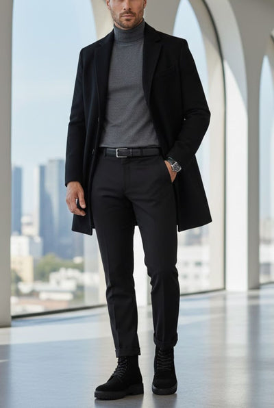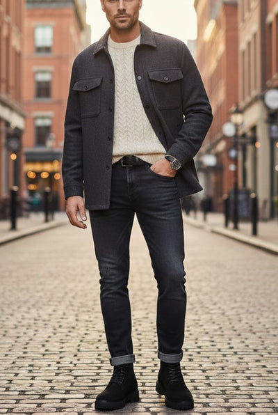 Integrating a sense of depth and contrast into your wardrobe is all about balancing the matte texture of suede with polished, seasonal colors. For a commanding urban look, these black suede lace-up boots provide a solid foundation for a monochromatic ensemble featuring a charcoal grey turtleneck, a structured black overcoat, and slim-fit black trousers. When shifting to a more relaxed aesthetic, the same boots anchor a layered combination of a cream cable-knit sweater, a dark grey wool shirt-jacket, and washed black denim. This mix of cool greys and warm neutrals creates a sophisticated visual texture that highlights the understated elegance of the suede, ensuring you look intentional whether you're in a high-rise office or walking through a historic city center.
